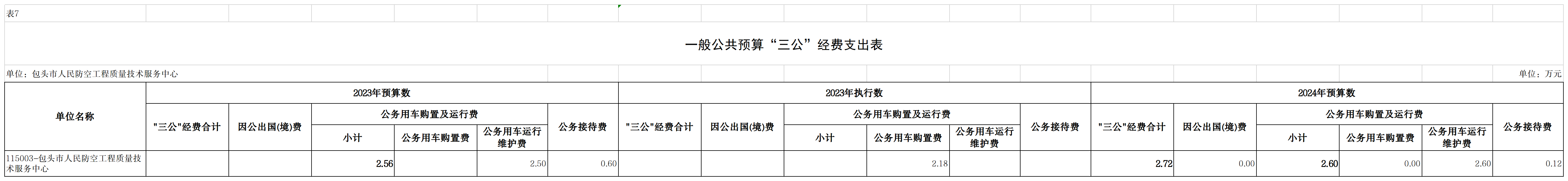 包头市人民防空工程质量技术服务中心单位2024年度一般公共预算拨款安排的“三公”经费预算支出2.72万元,其中因公出国(境)费支0万元,占“三公”经费的0%;公务用车购置及运行维护费支出2.6万元,占“三公”经费的95.59%;公务接待费支出0.12万元,占“三公”经费的4.41%。具体情况如下: