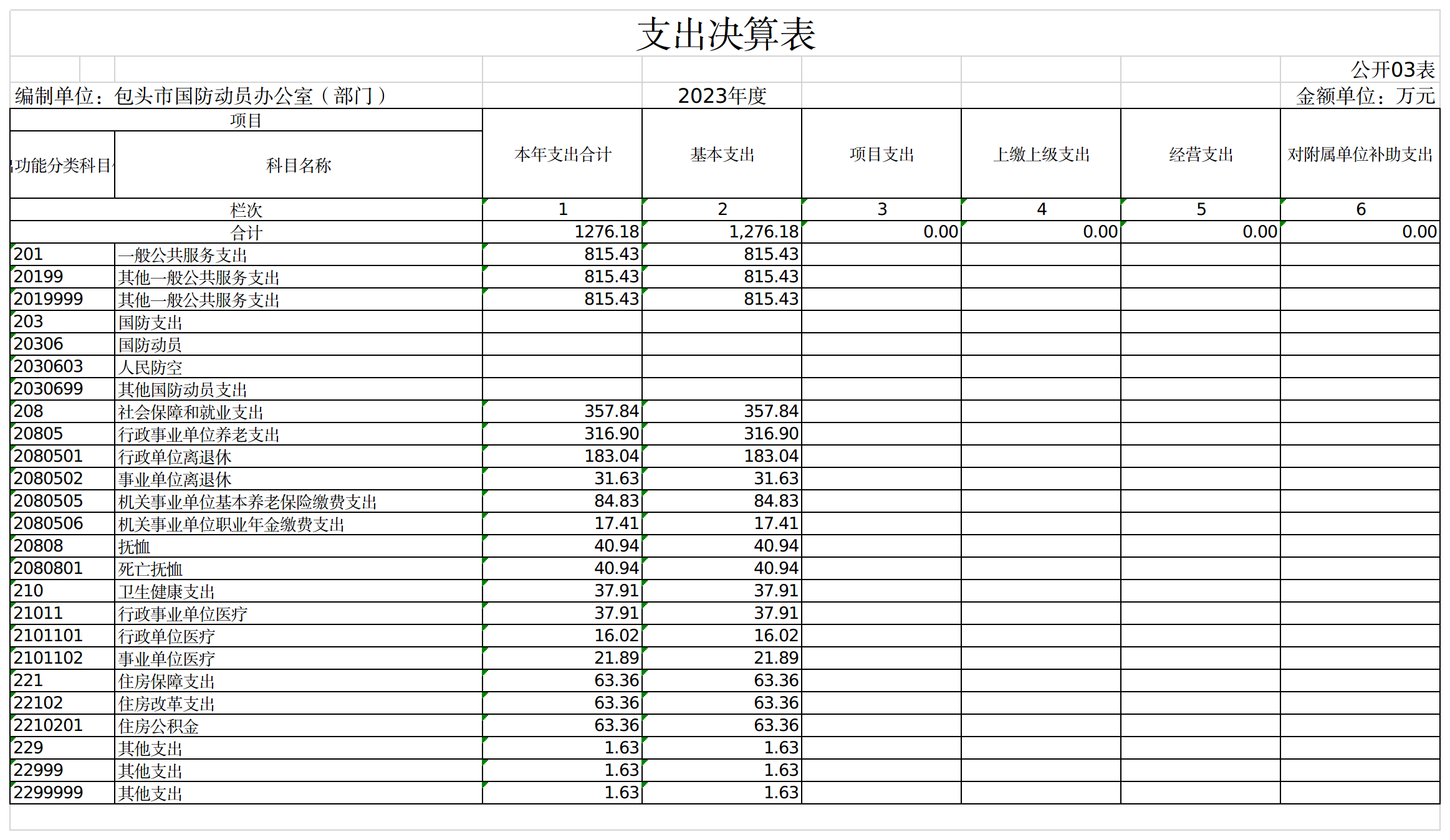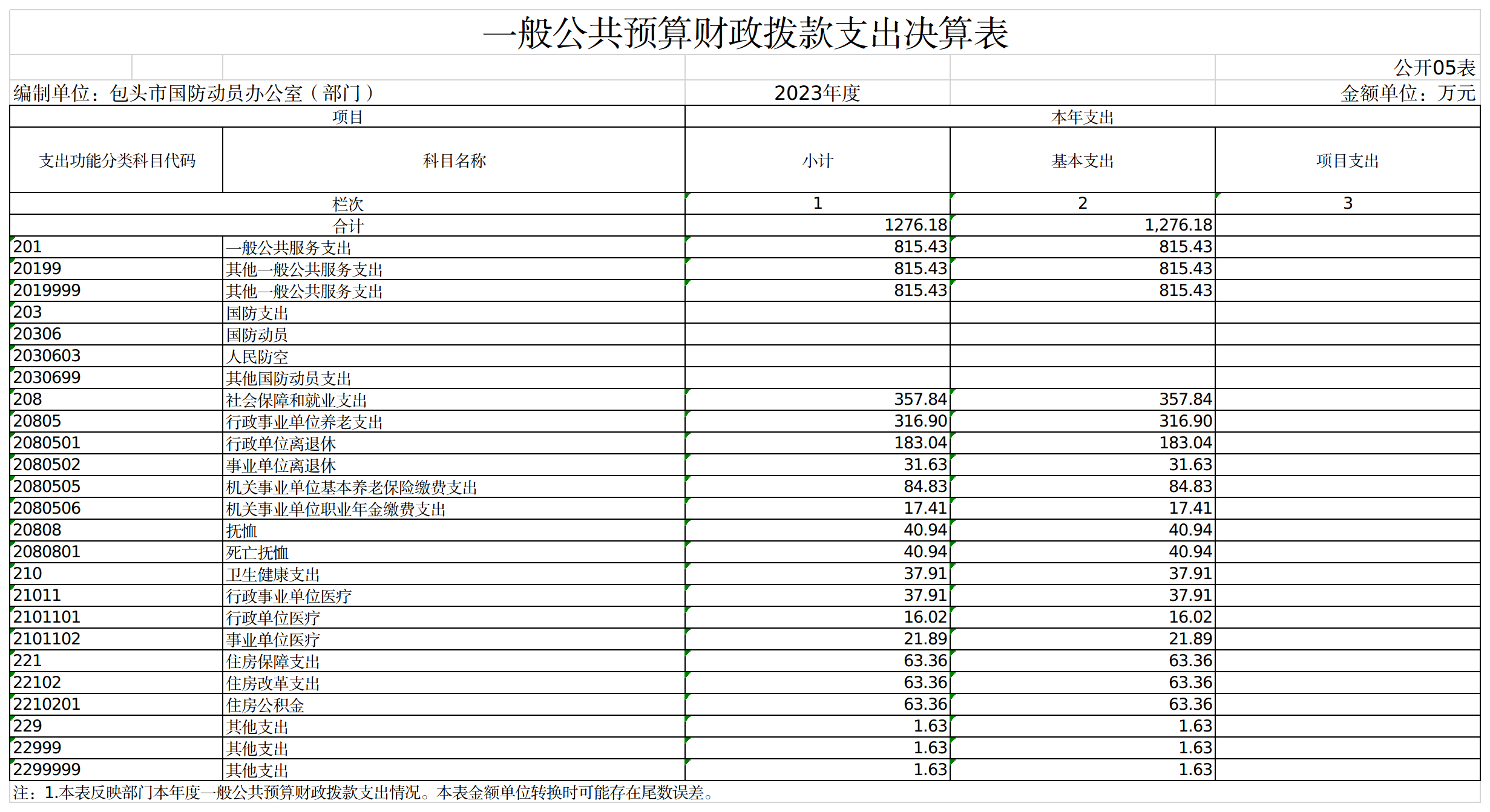 包头市国防动员办公室部门2023年度本年支出决算合计1276.18万元,其中: