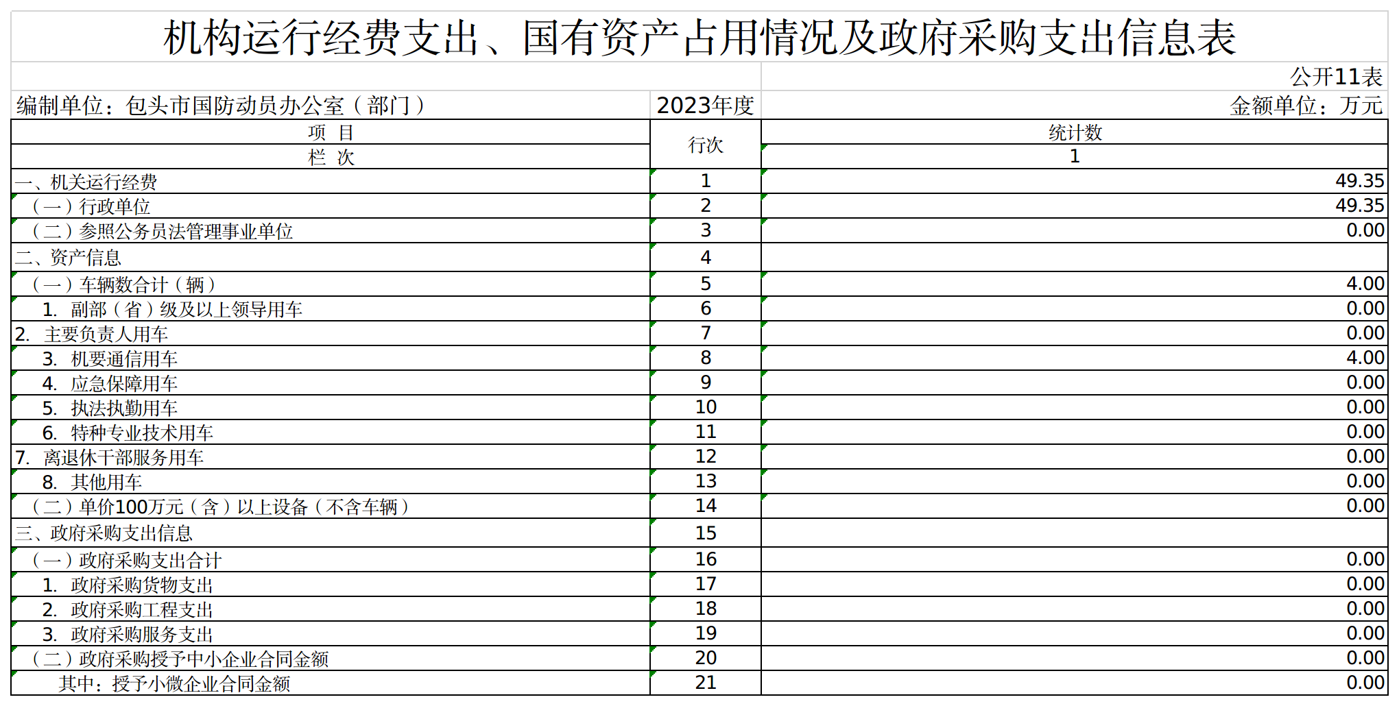包头市国防动员办公室部门截至2023年12月31日,本部门共有车辆4辆,其中:副部(省)级及以上领导用车0辆、主要负责人用车0辆、机要通信用车4辆、应急保障用车0辆、执法执勤用车0辆、特种专业技术用车0辆、离退休干部服务用车0辆,其他用车0辆;单价100万元(含)以上的设备(不含车辆)0台(套)。