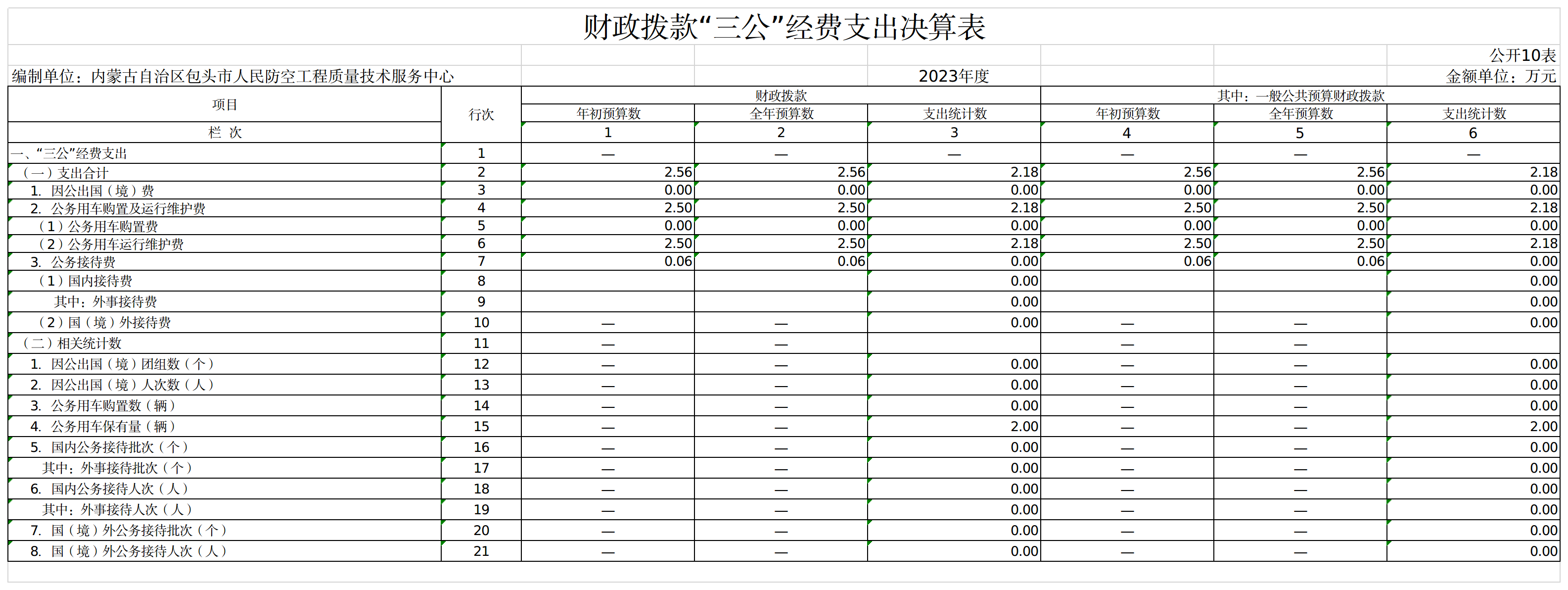 包头市人民防空工程质量技术服务中心 2023年度财政拨款“三公”经费全年预算 2.56万元,支出决算 2.18万元,完成预算的 85.16%。其中:因公出国(境)费全年预算 0.00万元,支出决算 0.00万元,完成预算的 0.00%;公务用车购置及运行维护费全年预算 2.50万元,支出决算 2.18万元,完成预算的 87.20%;公务接待费全年预算 0.06万元,支出决算 0.00万元,完成预算的 0.00%。2023年度一般公共预算财政拨款“三公”经费支出决算与预算差异原因合理控制支出。