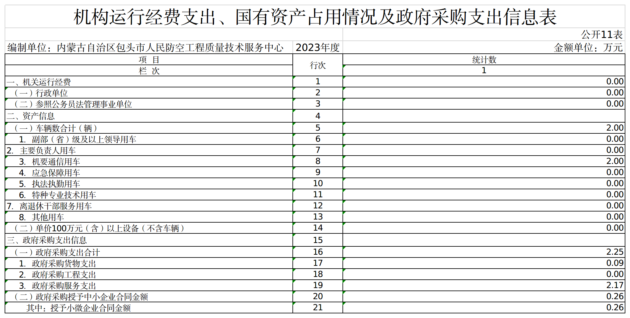 包头市人民防空工程质量技术服务中心 截至2023年12月31日,本单位共有车辆 2辆,其中:副部(省)级及以上领导用车0 辆、主要负责人用车 0辆、机要通信用车 2辆、应急保障用车 0辆、执法执勤用车 0辆、特种专业技术用车 0辆、离退休干部服务用车 0辆,其他用车 0辆;单价100万元(含)以上的设备(不含车辆) 0台(套)。