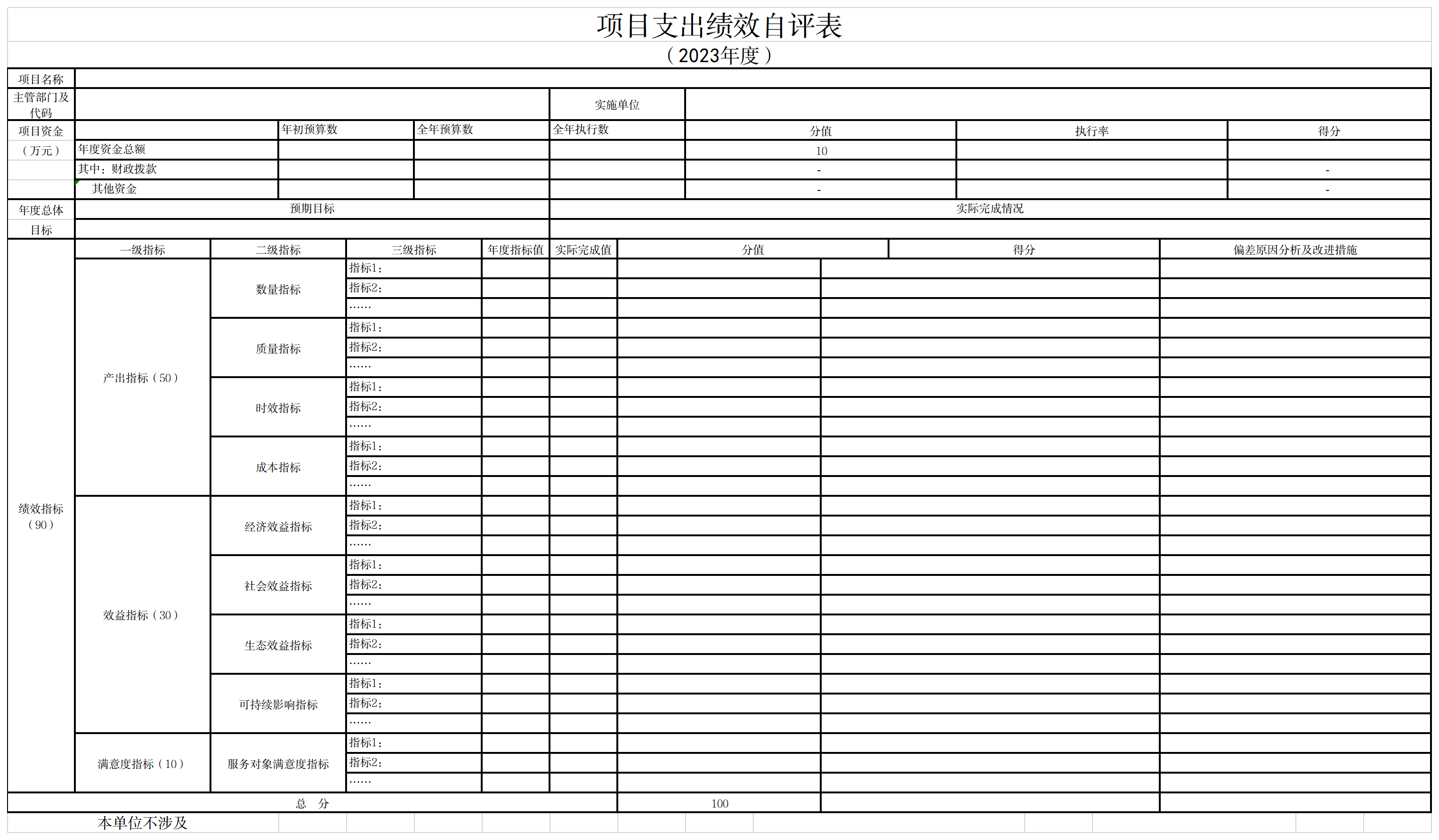 包头市人民防空工程质量技术服务中心 根据预算绩效管理要求组织对2023年一般公共预算项目支出全面开展绩效自评,其中一级项目0个,二级项目0个,共涉及资金0.00万元,占一般公共预算项目支出总额的0.00%;政府性基金预算项目0个,其中,一级项目0个,二级项目0个,共涉及资金0.00万元,占应纳入绩效自评的政府性基金预算项目支出总额的0.00%。
