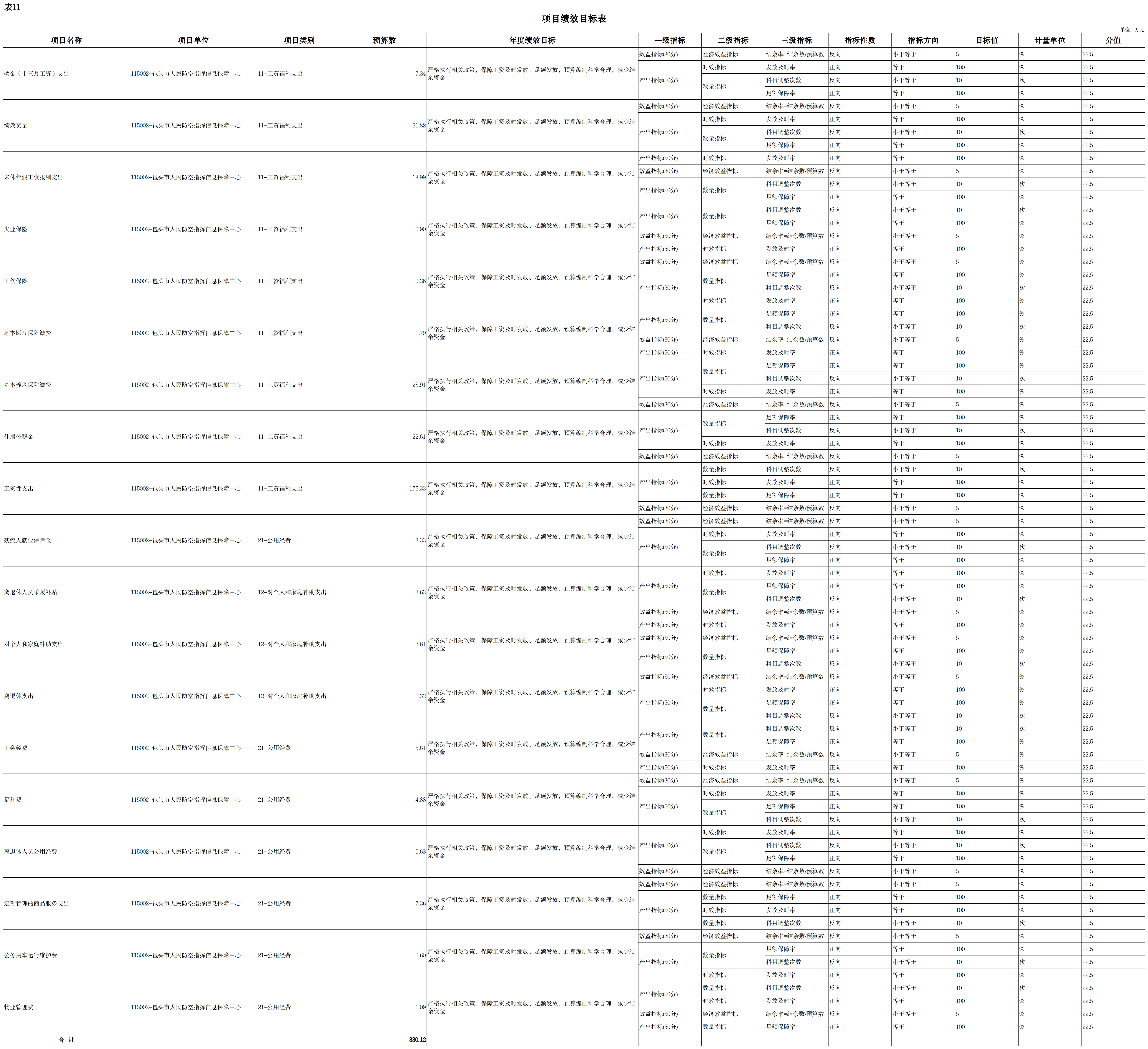 十一、项目绩效目标表