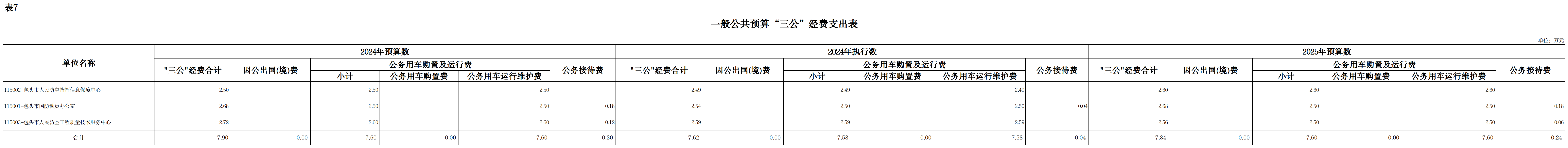 包头市国防动员办公室2025年度一般公共预算拨款安排的“三公”经费预算支出7.84万元,其中因公出国(境)费支出0.00万元,占“三公”经费的0.00%;公务用车购置及运行维护费支出7.60万元,占“三公”经费的96.94%;公务接待费支出0.24万元,占“三公”经费的3.06%。具体情况如下: